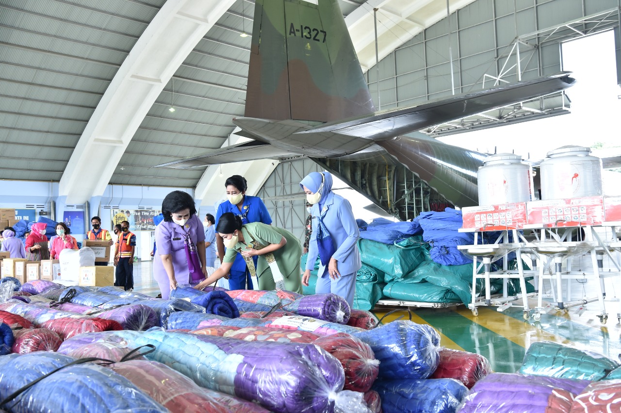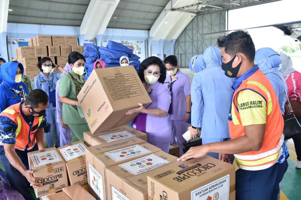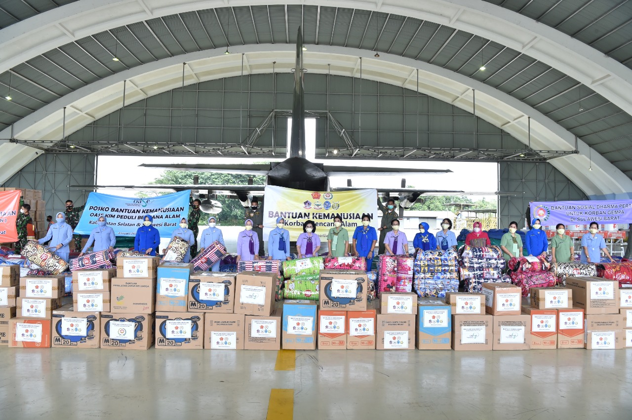 Jakarta, DUTAMEDAN.COM – Ketua Umum Dharma Pertiwi Ny. Nanny Hadi Tjahjanto yang juga bagian dari (Organisasi Aksi Solidaritas Era Kabinet Indonesia Maju) Oase-KIM menyalurkan bantuan untuk korban bencana alam banjir di Kalimantan Selatan dan korban bencana gempa bumi di Sulawesi Barat, bertempat di Lanud Halim Perdana Kusuma Jakarta Timur, Sabtu (16/1/2021).