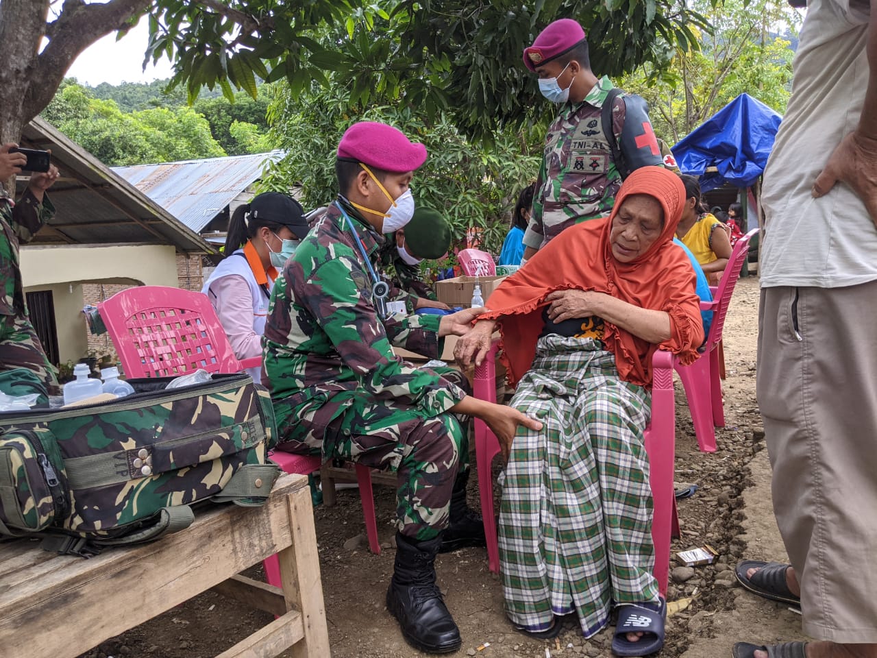 Satgas Kesehatan TNI gabungan dari Batalyon Kesehatan (Yonkes) 1 Kostrad, Yonkes 1 Marinir dan Yonkes Mabes TNI AU, dipimpin oleh Letda Laut (K) dr. Andre Prasetyo Mahesya masuk kampung secara door to door memberikan pelayanan kepada para korban bencana.
