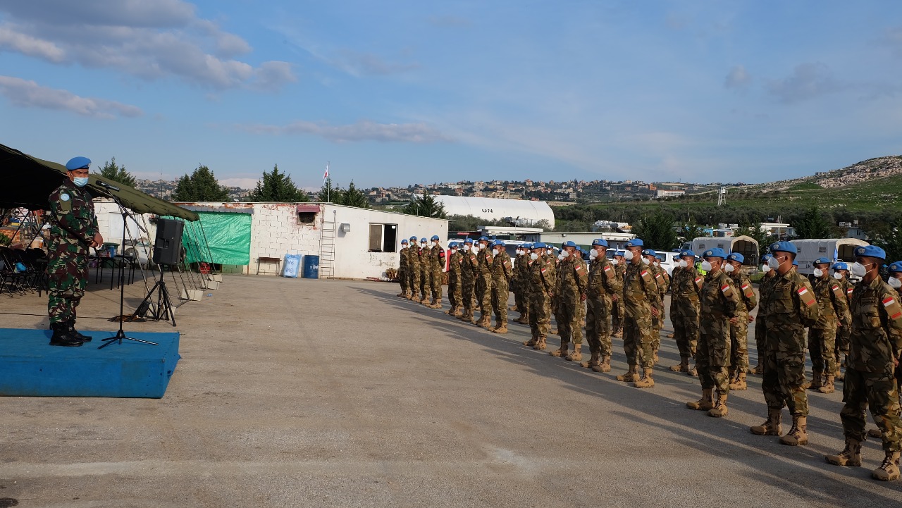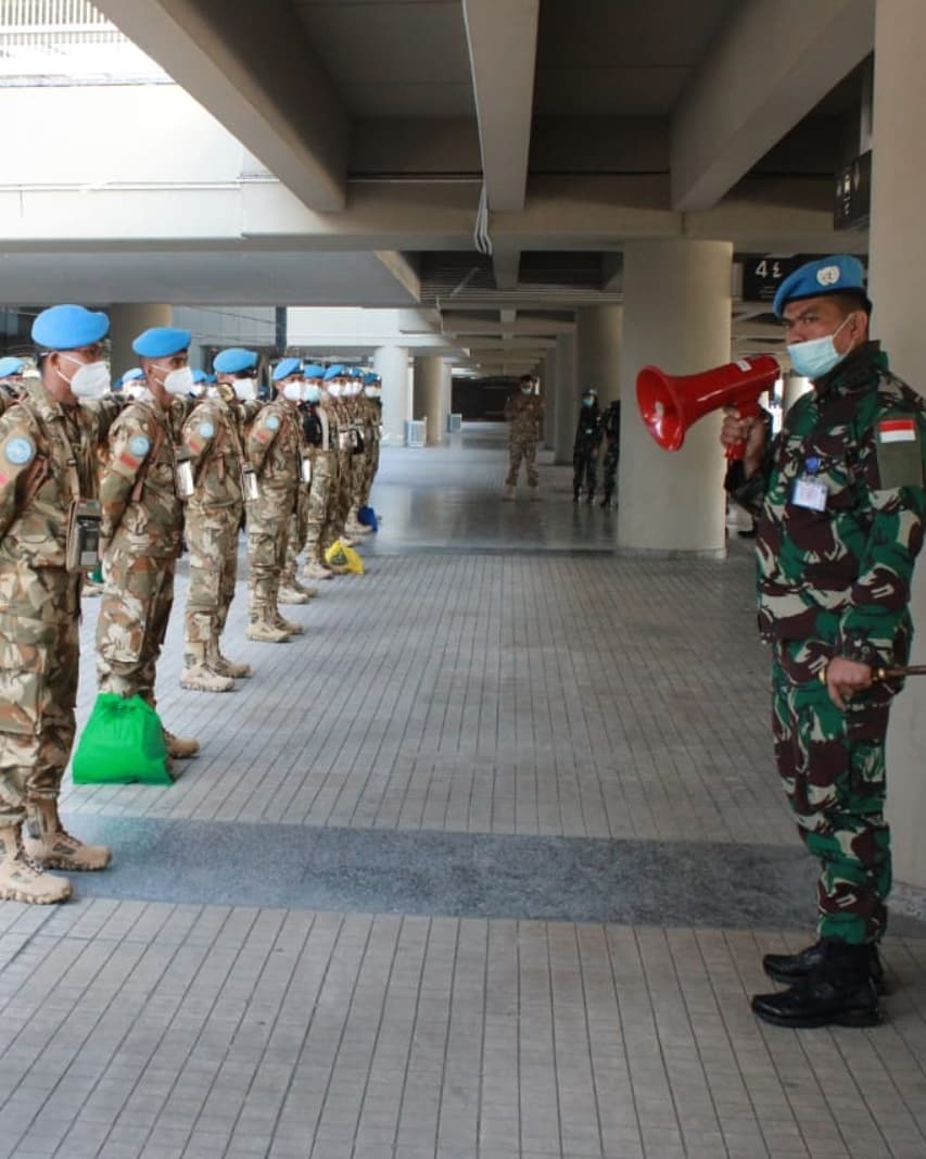 Komandan Kontingen Garuda Kolonel Inf Amril Haris Isya Siregar, S.E.,M.M. menyambut kedatangan Satgas Kontingen Garuda 2020-2021 di Bandara Internasional Beirut Rafic Hariri Lebanon. Seluruh personel terlebih dahulu melaksanakan protokol kesehatan mulai dari penyemprotan disinfektan, pengecekan suhu tubuh dan penggunaan handsanitizer.