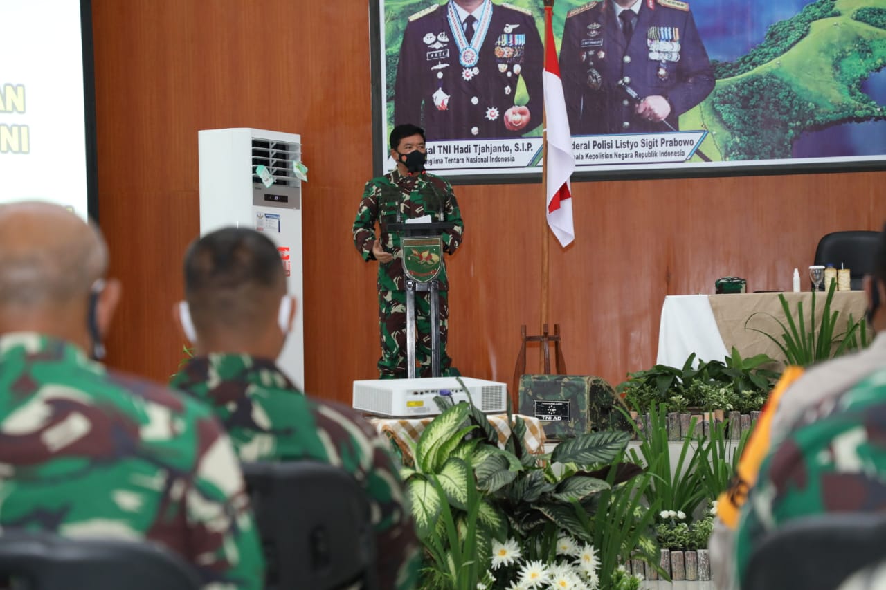 Jakarta, DUTAMEDAN.COM – Panglima TNI Marsekal TNI Hadi Tjahjanto, S.I.P., bersama Kapolri Jenderal Pol Drs. Listyo Sigit Prabowo, M.Si., memberikan pengarahan kepada Prajurit TNI dan Anggota Polri di Batalyon Infanteri Raider 751/Vira Jaya Sakti, Jayapura. Jumat (26/02/2021).