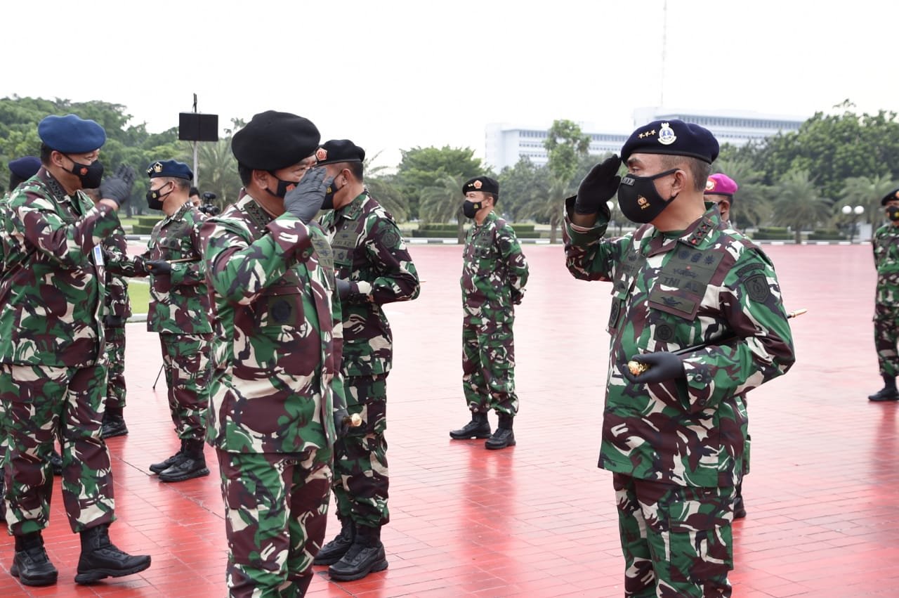 Panglima TNI Marsekal TNI Dr. (H.C.) Hadi Tjahjanto, S.I.P. menerima Laporan Korps Kenaikan Pangkat 57 Perwira Tinggi (Pati) TNI terdiri dari 16 Pati TNI AD, 23 Pati TNI AL dan 18 Pati TNI AU, bertempat di Mabes TNI, Cilangkap, Jakarta Timur, Rabu (17/3/2021).