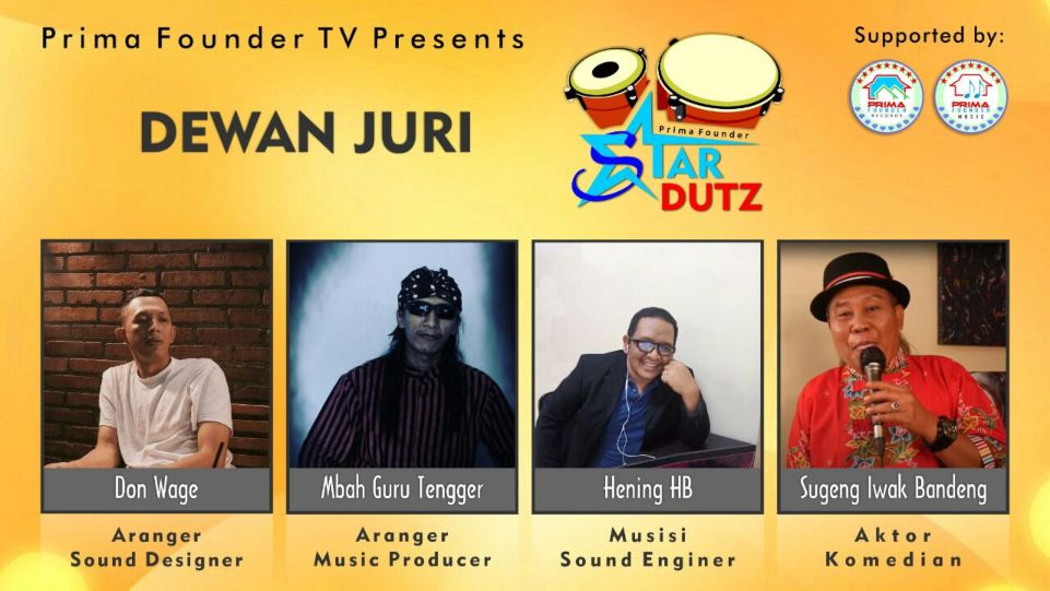 Oleh sebab itu Prima Founder TV telah menunjuk Dewan Juri berkompeten dalam pemilihan talent terbaik. Dewan juri yang terlibat dalam periode pertama Prima Founder STARDUTZ yaitu; Mbah Guru Tengger (Arranger, Musik Producer), Don Wage (Arranger, Sound Designer), Hening HB (Musisi, Sound Enginer), dan Sugeng Bandeng (Aktor, Komedian).