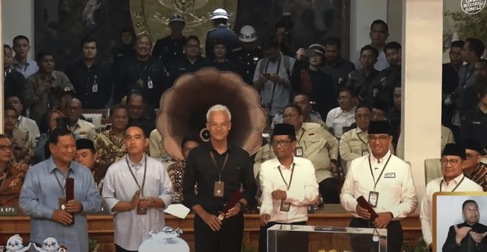 Pasangan Anies-Cak Imin nomor urut 1, pasangan Prabowo-Gibran nomor urut 2, dan pasangan Ganjar-Mahfud Md nomor urut 3. Nomor urut Pilpres 2024 itu kemudian ditetapkan oleh KPU.