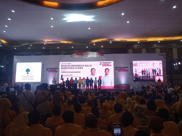 Medan, DUTAMEDAN.COM – Konsolidasi Koalisi Indonesia Maju (KIM) Sumatera Utara (Sumut) memenangkan Prabowo Subianto-Gibran Rakabuming Raka dalam ajang Pilpres 2024, digelar di Medan International Convention Center (MICC), Jalan Gagak Hitam Medan, Sabtu (18/11/23). KIM membidik satu putaran untuk memenangkan pasangan tersebut.