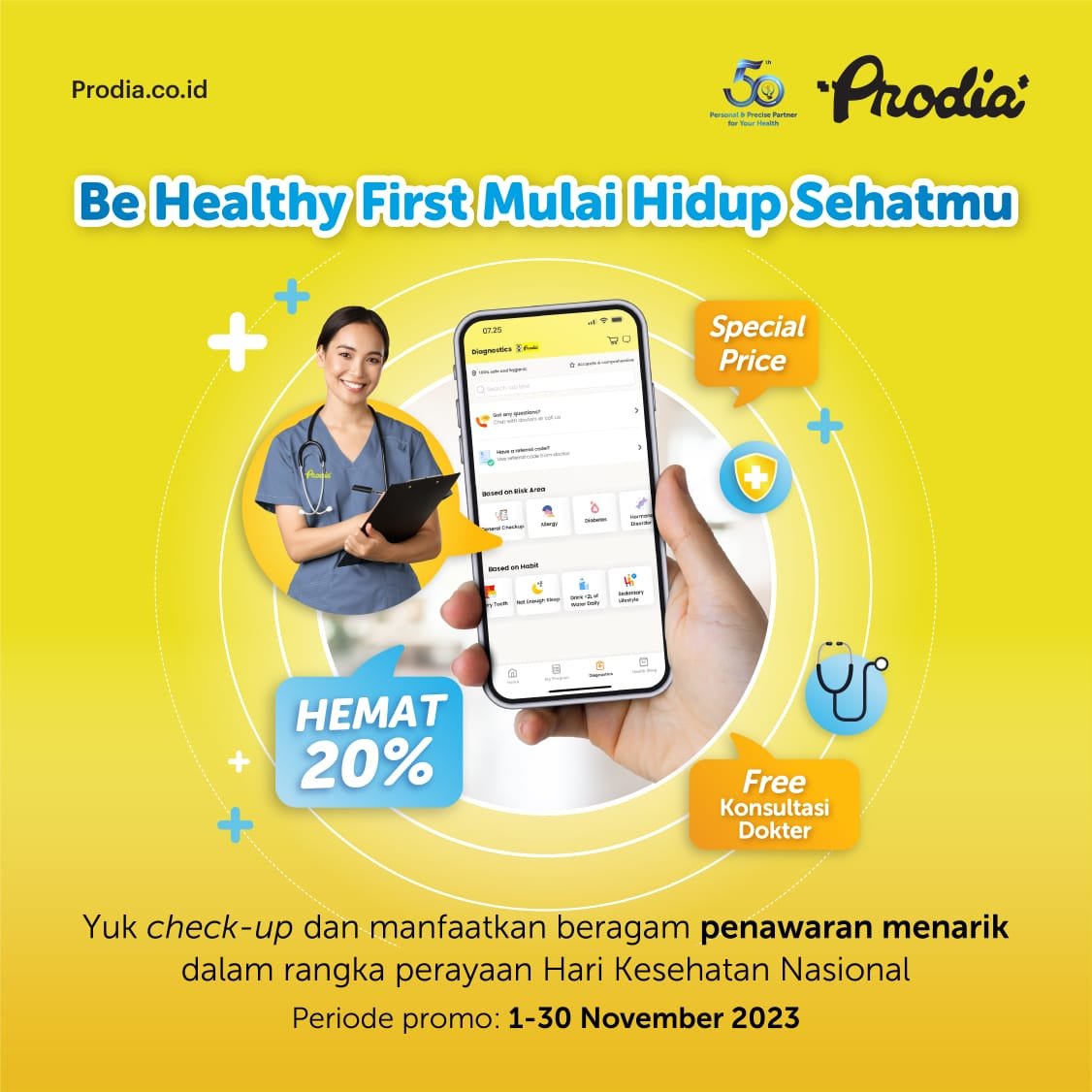 Selain panel khusus diabetes, dalam rangka hari kesehatan nasional, Prodia juga memberikan beragam penawaran lainnya, seperti hemat 20% untuk semua pemeriksaan, Harga spesial untuk Paket Healthier with Prodia 1 senilai Rp. 789.000 & Paket Healthier with Prodia 2 senilai Rp. 999.000, yang merupakan pemeriksaan dasar untuk mengetahui kondisi kesehatan secara umum dengan mendeteksi risiko penyakit yang berpotensi terjadi di kemudian hari.