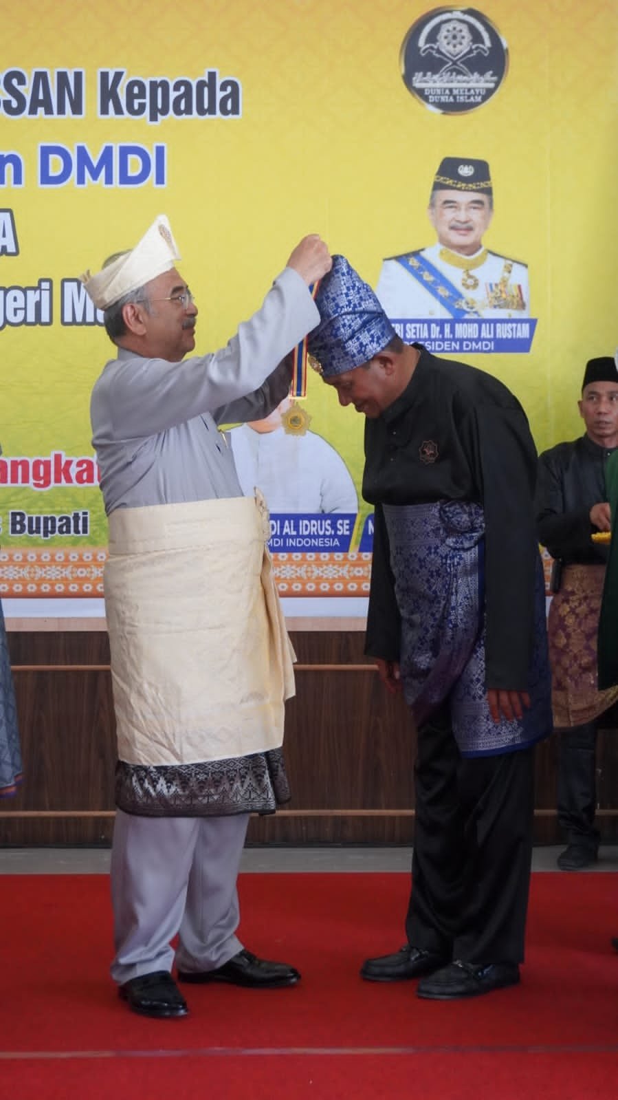 LANGKAT, DUTAMEDAN.COM – Presiden Dunia Melayu Dunia Islam (DMDI) Tuan Yang Terutama Tun Sei Setia TUN Dr. H. Mohd. Ali Rustam Yang di Pertua Negeri Malaka memberikan anugerah Temenggong Tun Hassan kepada Plt Bupati Langkat H Syah Afandin.