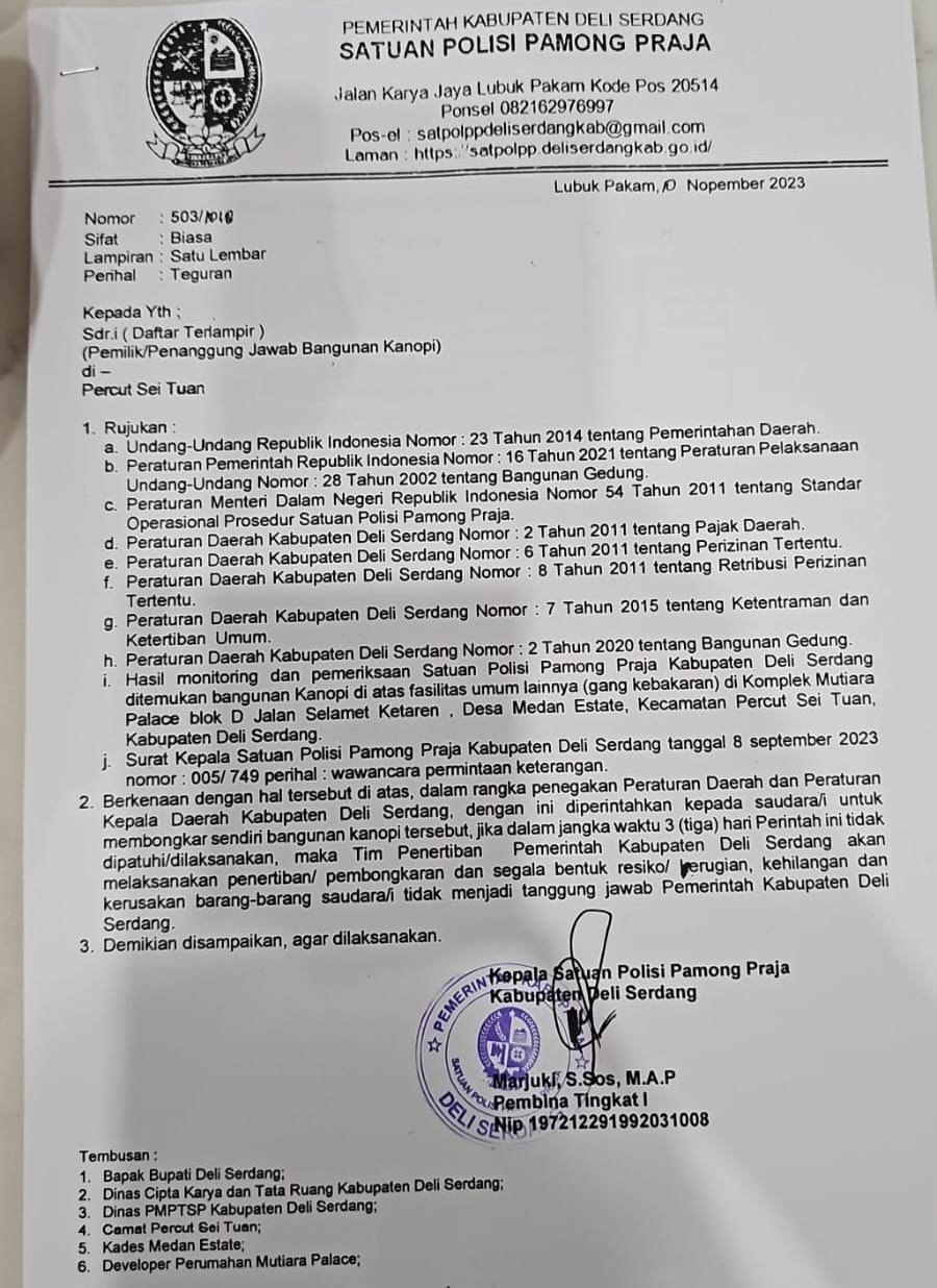 Terpisah, Kasat Pol PP Deli Serdang Marjuki, S. Sos, MAP melalui Kepala Tugas Pelaksaan, Roi Alexander Sirait saat dikonfirmasi membenarkan surat terguran tersebut.