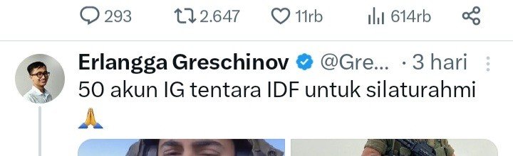 Sontak saja, postingan akun @Greschinov ini disambut antusias oleh para Netizen Indonesia, mereka berduyun-duyun memburu puluhan link IG tentara IDF yang telah disebarkan oleh @Greschinov tersebut. tentu saja silaturahmi yang terwujud di sana bukan bernada sahabat melainkan kecaman dan sindiran terhadap tentara IDF atas agresi militer mereka di Palestina yang sudah memasuki 45 hari.