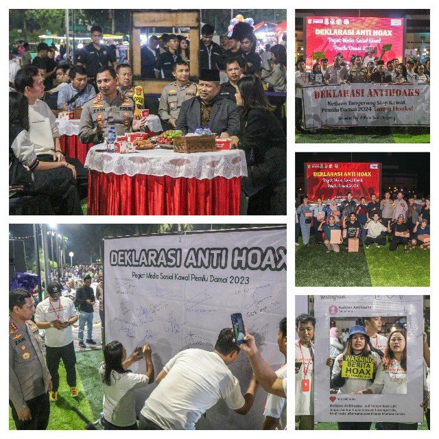 DUTAMEDAN.COM, KOTA TANGERANG – Polres Metro Tangerang Kota, Polda Metro Jaya menggelar Deklarasi Anti Hoax bersama Penggiat Media Sosial Kawal Pemilu Damai 2024. Kegiatan tersebut berlangsung di Taman Elektrik Pusat Pemerintahan Kota (Puspemkot) Tangerang Jalan Satria Sudirman Kelurahan Sukaasih, Kecamatan Tangerang. Sabtu, (25/11) malam WIB.