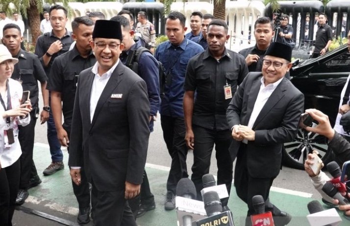 Kemudian, pasangan calon nomor urut 1, Anies Baswedan-Muhaimin Iskandar tiba di lokasi acara pukul 14.20 WIB. Keduanya, tampak kompak mengenakan setelan jas berwarna hitam.
