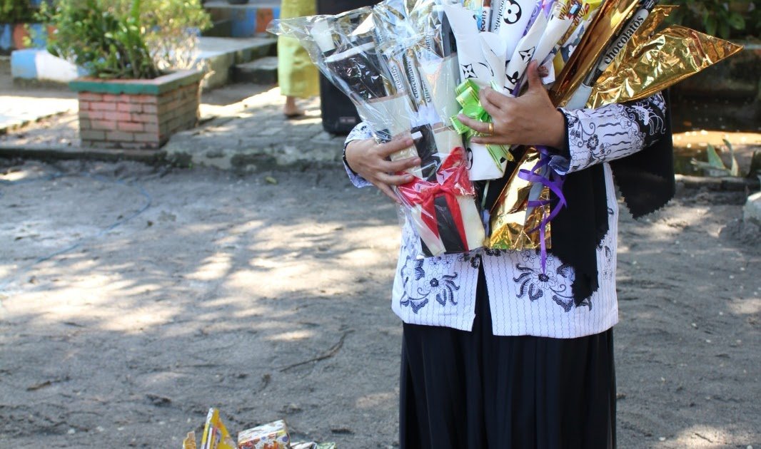 Di antara 34 murid di kelas 1 ,Rahmadayani menerima 32 hadiah dalam bentuk kado dan buket yang di berikan muridnya di dampingi Orang tua murid.