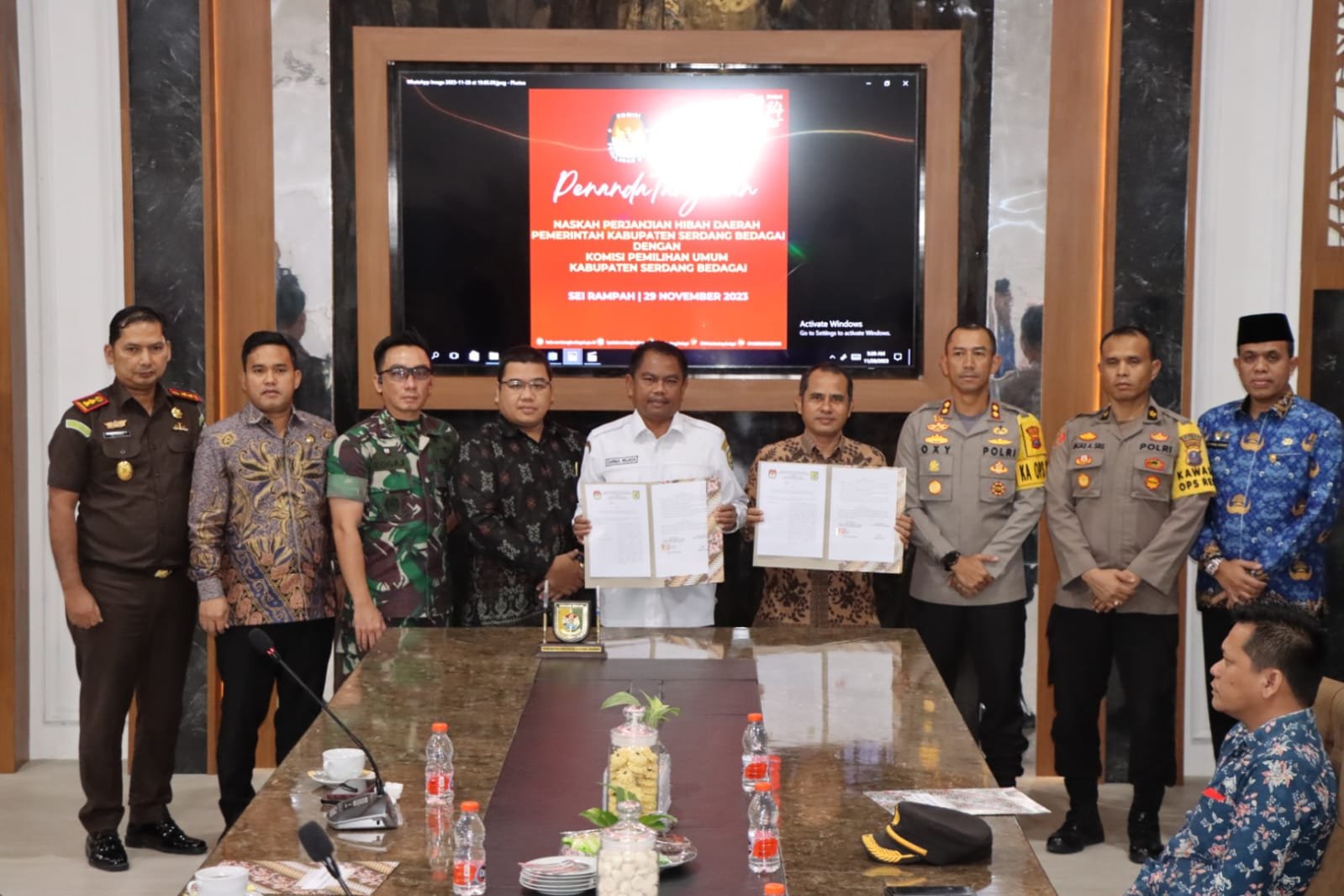 Kapolres Serdang Bedagai AKBP Oxy Yudha Pratesta, SIK menghadiri Kegiatan acara ini dalam Penandatanganan Naskah Perjanjian Hibah Daerah (NPHD) Pemkab Serdang Bedagai untuk pendanaan kegiatan Pemilihan Kepala Daerah Tahun 2024 kepada KPU Kabupaten Serdang Bedagai dan Bawaslu Kabupaten Serdang Bedagai.