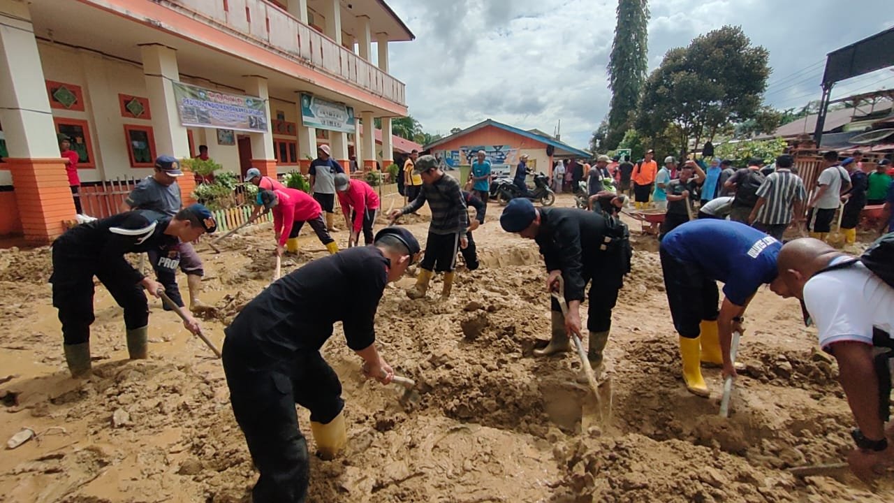 Ratusan Guru dan Brimob Bersihkan Bekas Banjir di Sejumlah Sekolah di Trumon