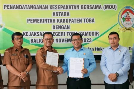 Kabupaten Toba, DUTAMEDAN.COM – Bersama Jaksa Pengacara Negeri (JPN) sekaligus Kepala Kejaksaan Negeri Toba Samosir, Dohar Nosib Wirawarman Nainggolan, Bupati Toba, Ir. Poltak Sitorus meneken Memorandum of Understanding (MoU) atau Kesepakatan Bersama antara Pemerintah Kabupaten Toba dengan Kejaksaan Negeri Toba Samosir yang dilakukan di Ruang Rapat Staf Ahli Bupati, Kantor Bupati Toba, Balige,Selasa, (28/11/ 2023).