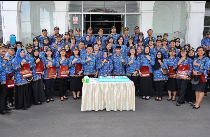Selanjutnya dr Susanti bersama Pj Sekda Mulyono memotong kue ulang tahun ke-52 Korpri. ( JS ).
