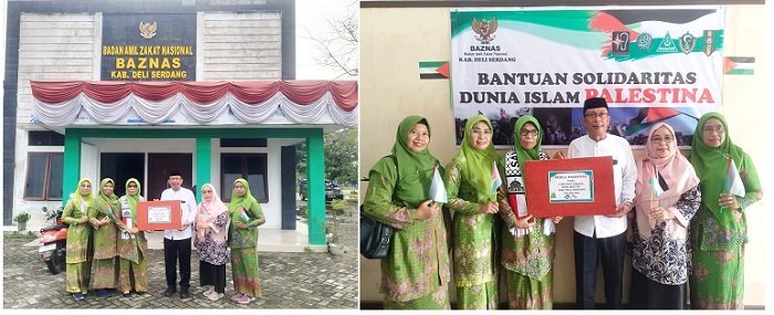Bantuan peduli masyarakat Gaza Palestina diserahkan secara langsung oleh Ketua Pengurus Cabang (PC) Muslimat NU Deliserdang Wastiana Harahap, kepada Ketua Badan Amil Zakat Nasional (Baznas) Deliserdang H. Surya Syahputra, di kantor Baznas Deliserdang, Jumat (1/12).