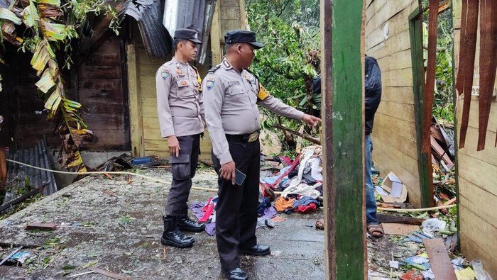 “Hasil Olah TKP dan keterangan saksi yang dihimpun di tempat kejadian, saat itu gerimis datang tiba-tiba angin puting beliung pun datang dengan kencang. Akibatnya pohon kemiri yang berada di belakang rumah itu pun menimpa rumah mereka hingga atapnya roboh sampai ke ruang tengah,” ujarnya.