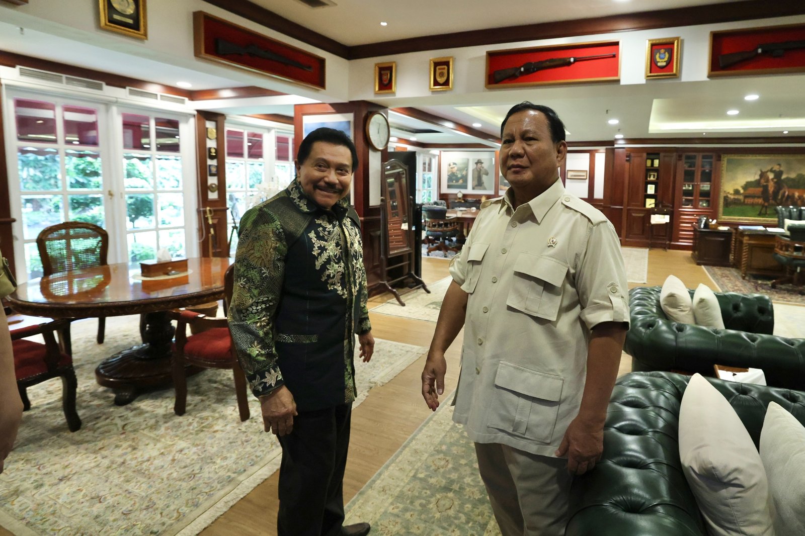 Prabowo dan Hendropriyono melanjutkan perbincangan akrab di dalam ruang kerja di kantor Kementerian Pertahanan RI.
