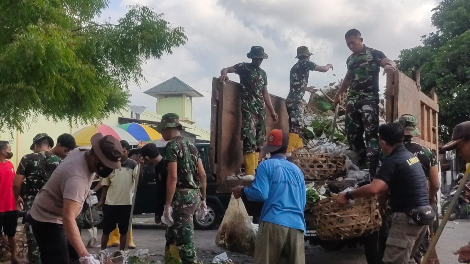 Hari ini, Kodim 1615/Lotim kembali melaksanakan pembersihan Pasar Umum Tanjung Kelurahan Tanjung Kecamatan Labuhan Haji Lombok Timur, Kamis (7/12). Aksi bersih-bersih yang melibatkan personel TNI, Polri, Pemerintah Kecamatan Labuhan Haji, Satpol PP dan Linmas terlihat kompak mengangkat sampah yang sudah menumpuk maupun yang ada di saluran got seputar pasar. Tidak mau ketinggalan ibu-ibu Persit KCK Cabang XXIX Dim 1615 dan warga yang berjualan Pasar Umum Tanjung juga ikut mengambil peran dalam menjaga kebersihan lingkungan.