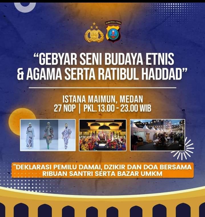 Sumut, DUTAMEDAN.COM – Polda Sumatera Utara menyelenggarakan kegiatan gebyar seni budaya lintas etnis dan agama di Istana Maimun, Medan, Senin (27/11)