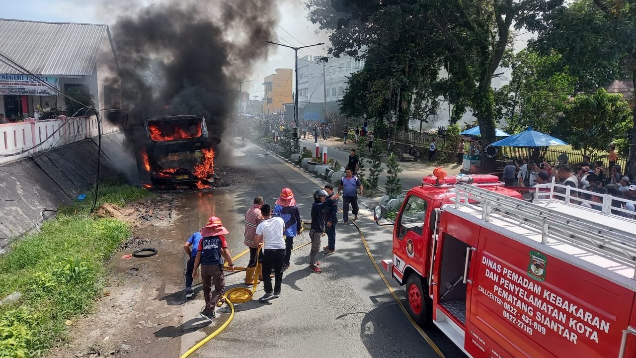 Tidak sampai satu jam kemudian, atau sekitar pukul 10.50 WIB, tetiba mereka melihat kobaran api di bagian belakang bus tersebut. Api pun cepat membesar.