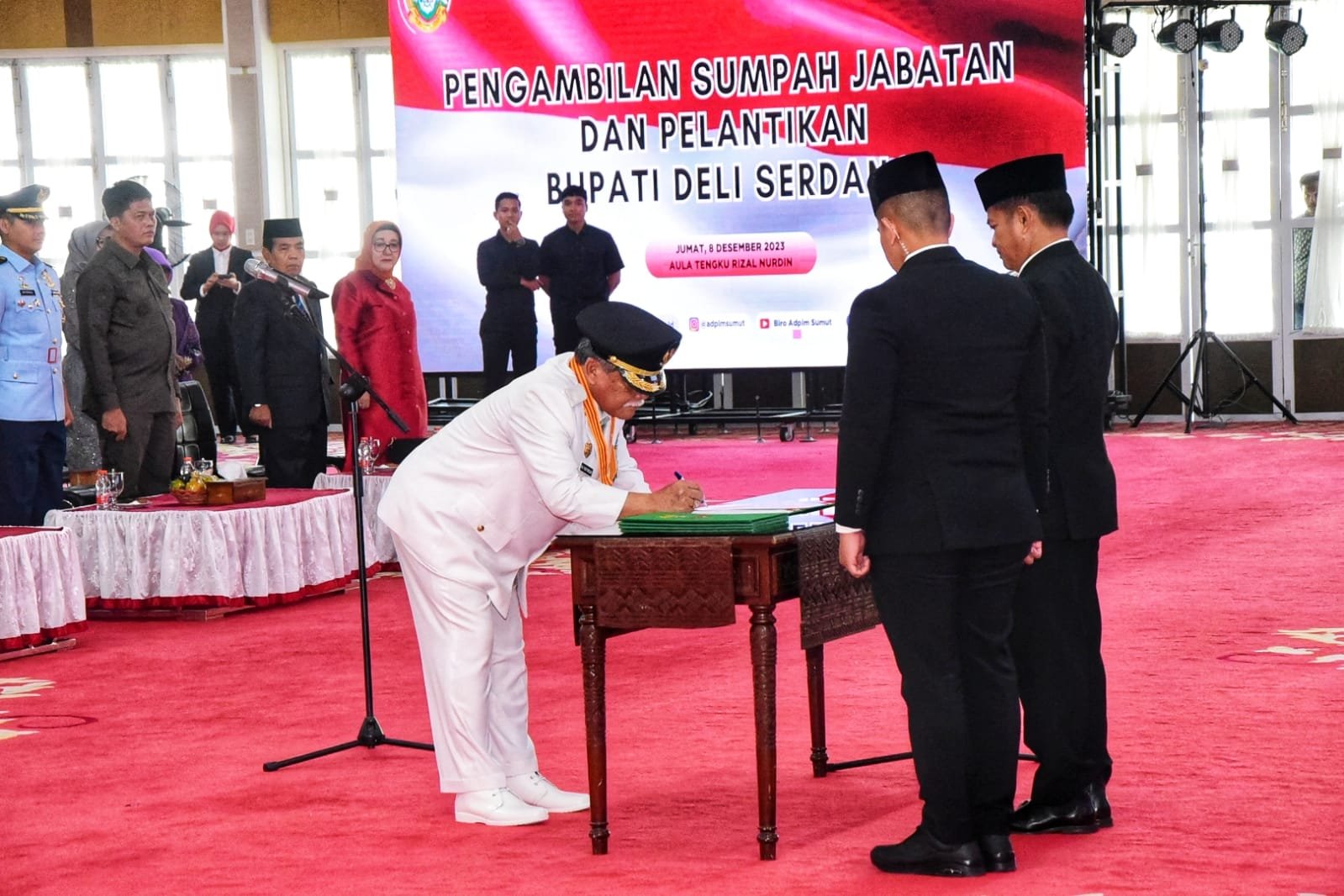 DUTAMEDAN.COM, MEDAN – Pelaksana Tugas (Plt) Bupati Deli Serdang, HM Ali Yusuf Siregar resmi dilantik menjadi Bupati Deli Serdang definitif oleh Penjabat Gubernur Sumatera (Pj Gubsu), Dr Hassanudin di Aula T Rizal Nurdin, Rumah Dinas Gubernur Sumatera Utara, Jalan Sudirman, No.41, Medan, Jumat (8/12/2023), sekira pukul 14.33 WIB.