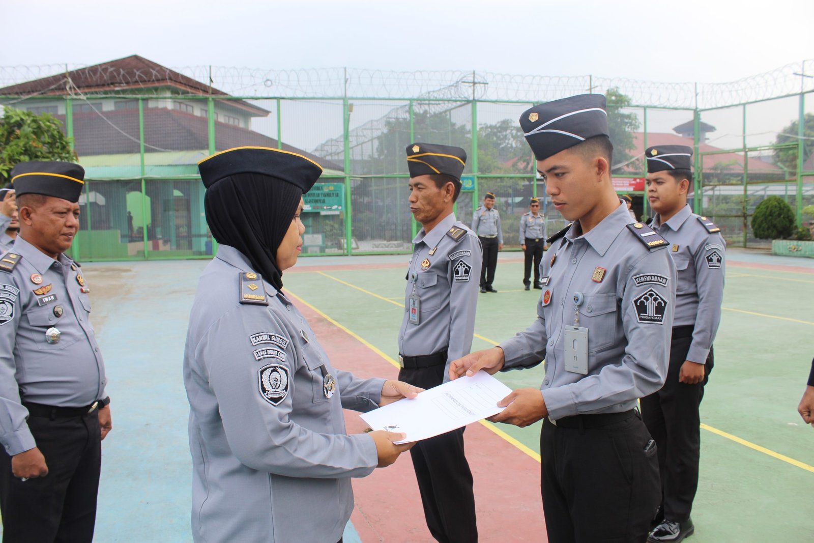 Muara Enim, DUTAMEDAN.COM – Tingkatkan Disiplin Pegawai , Kalapas Muara Enim Mukhlisin Fardi Melalui Kasubbag TU Devi Damayanti berikan PIN kepada pegawai teladan periode bulan November Bertempat Lapangan Lapas Muara Enim. (Senin , 11/12/2023)