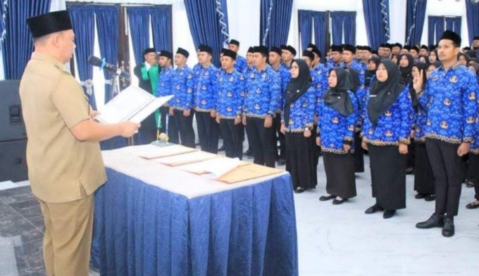 LABUHANBATU, DUTAMEDAN.COM – Bupati Labuhanbatu dr H Erik Adtrada Ritonga MKM, memimpin upacara pengambilan sumpah 387 Pegawai Negeri Sipil (PNS) yang baru diangkat, di Aula Rumah Dinas Bupati, Jalan WR Supratman Rantauprapat Kecamatan Rantau Utara, Senin (12/12).