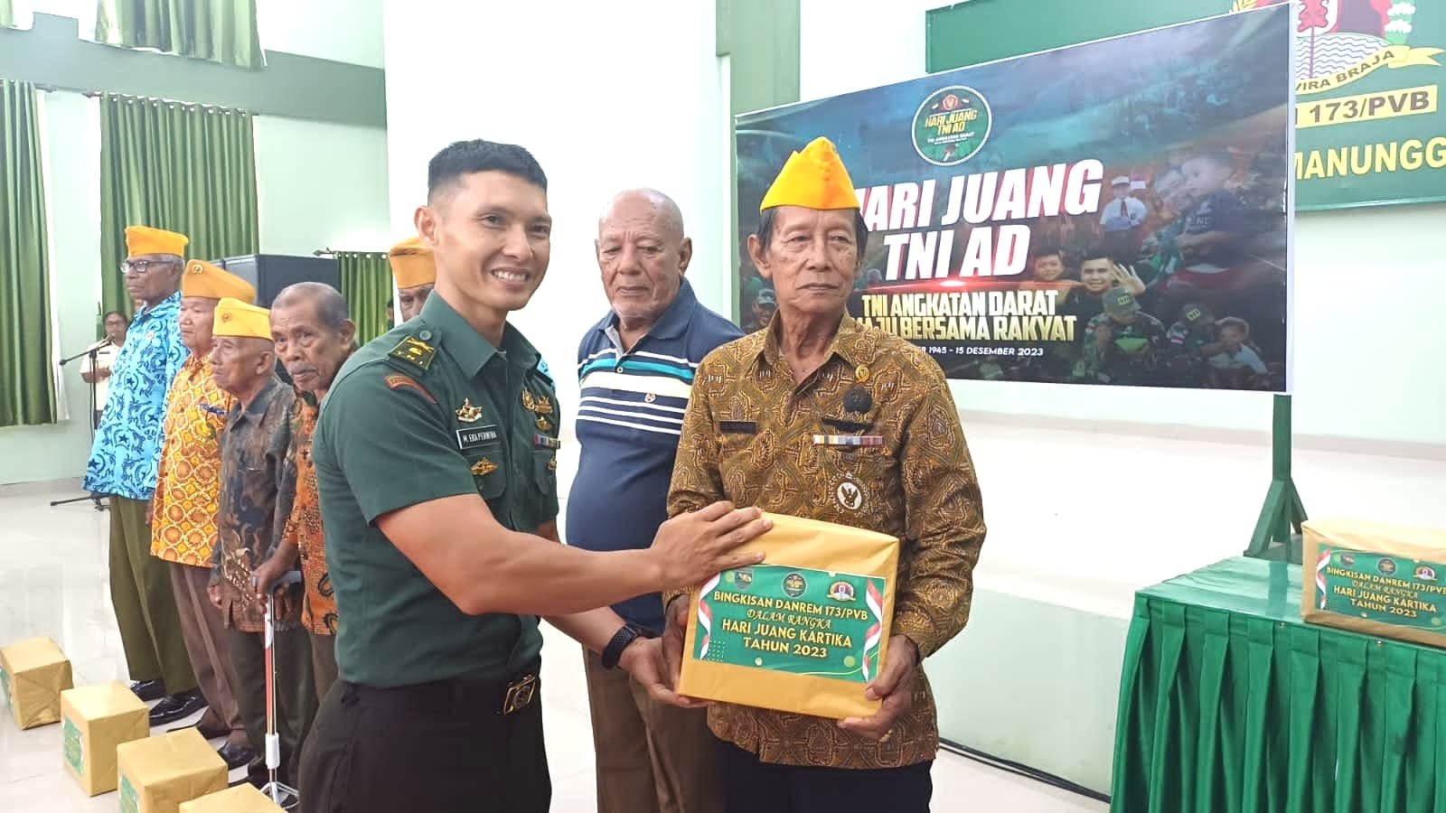 Biak, DUTAMEDAN.COM – Dalam rangka menyambut Hari Juang TNI-AD Ke-78, Kodim 1708/BN memberikan santunan dan paket sembako kepada veteran di Aula Korem 173/Praja Vira Braja Distrik Samofa, Kabupaten Biak Numfor, Papua, Rabu (13/12/2023).
