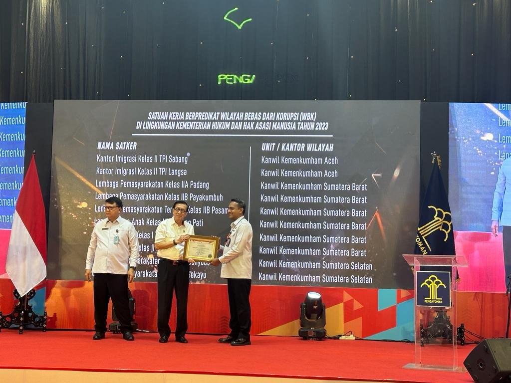 Sedangkan dalam lingkup Kantor Wilayah Kemenkumham Sumbar, 6 satuan kerja yang mendapat predikat WBK diantaranya Lapas Kelas IIB Tanjung Pati (Ex. Lapas Payakumbuh) , Kanim Agam, Kanim Padang, dan Lapas Kelas IIA Padang, Lapas Terbuka Pasaman dan LPKA Tanjung Pati