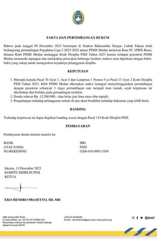 “Klub PSMS Medan dikenakan sanksi larangan menyelenggarakan pertandingan dengan penonton sebanyak 3 pertandingan saat menjadi tuan rumah,” demikian isi surat tersebut.