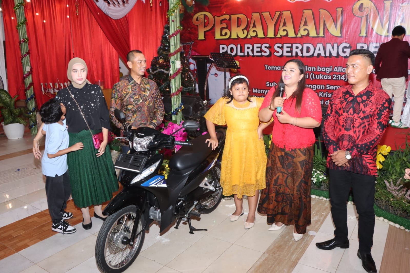 Perayaan Natal juga diisi pemberian bingkisan Natal kepada para purnawirawan dan warakawuri Polres Sergai, dan penarikan lucky draw dengan hadiah utama 1 unit sepeda motor sumbangan Kapolres Sergai AKBP Oxy Yudha Pratesta, serta diakhiri makan malam bersama.