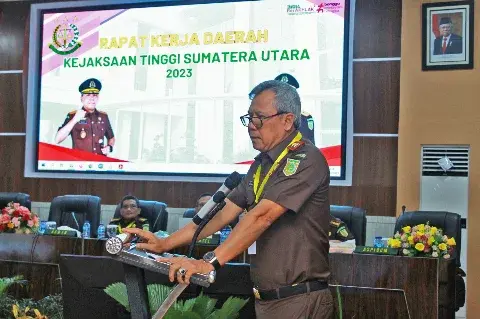 DUTAMEDAN.COM – Kepala Kejaksaan Tinggi Sumatera Utara Idianto SH MH didampingi Wakajati Sumut M Syarifuddin SH MH dan para Asisten membuka secara resmi pelaksanaan Rapat Kerja Daerah (Rakerda) Tahun 2023 di Aula Sasana Cipta Kerta Lantai 3 Kantor Kejati Sumut Jalan AH Nasution Medan, Senin (18/12/2023).