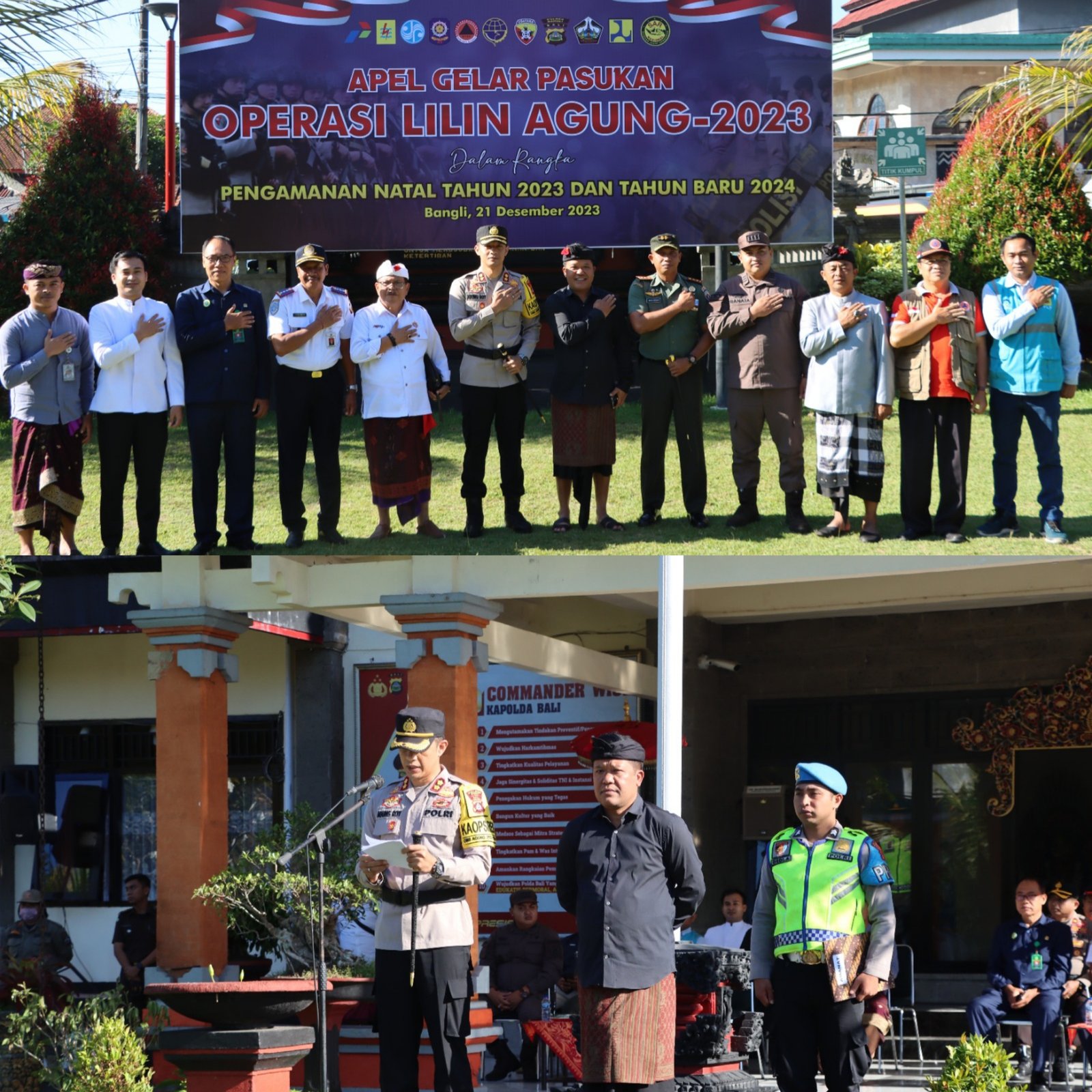 Apel gelar pasukan ditandai dengan Perwakilan penyematan tanda pita ops oleh Kapolres Bangli kemudian membacakan sambutan Kapolri Jenderal Listyo Sigit Prabowo kepada peserta apel, “bahwa Apel Gelar Pasukan Ops Lilin Agung 2023 yang diselenggarakan ini digelar secara serentak di seluruh jajaran Polri, mulai dari tingkat Mabes Polri hingga kesatuan kewilayahan.