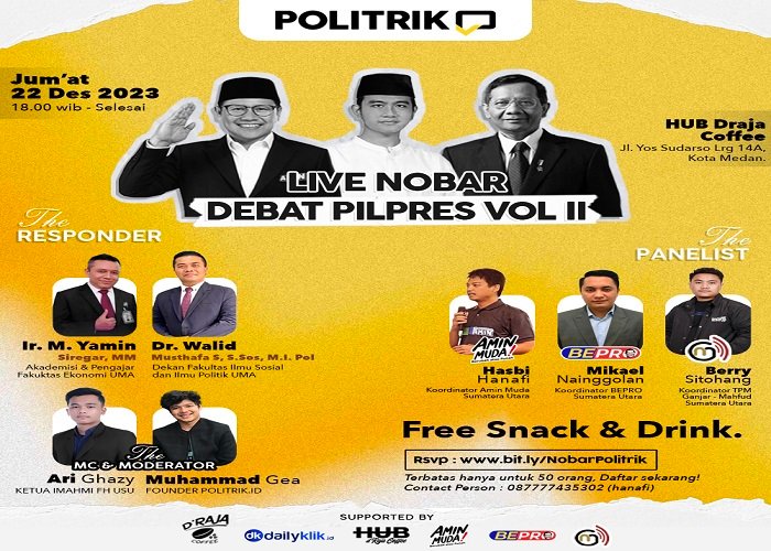 Tidak kalah pentingnya yang dilakukan oleh kalangan generasi GenZ yang terlibat dalam Diskusi Debat Pilpres yang dikemas dalam Nonton bareng (Nobar), seperti yang digelar oleh Politrik.id pada malam nanti, Jumat 22 Desember 2023. Politrik.id sendiri merupakan sebuah lembaga/wadah diskusi Politik tanah air yang inisiasi oleh anak-anak muda GenZ di Medan.