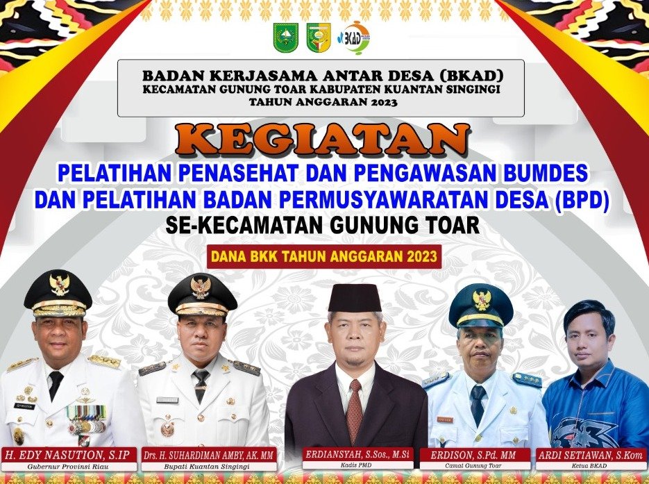 Ketua BKAD Kecamatan Gunung Toar Ardi Setiawan S,Kom juga mengucapkan ribuan terima kasih kepada seluruh anggota BKAD gunung toar karena sudah dipercaya sebagai ketua Panitia pelaksana,harapan kedepan dengan adanya pelatihan ini kita dapat bekerja sama dalam mewujudkan sumber daya manusia yang berkualitas,sehingga BPD dan BUMDES benar-benar memahami dan mengaplikasikan tata kelola keuangan Desa