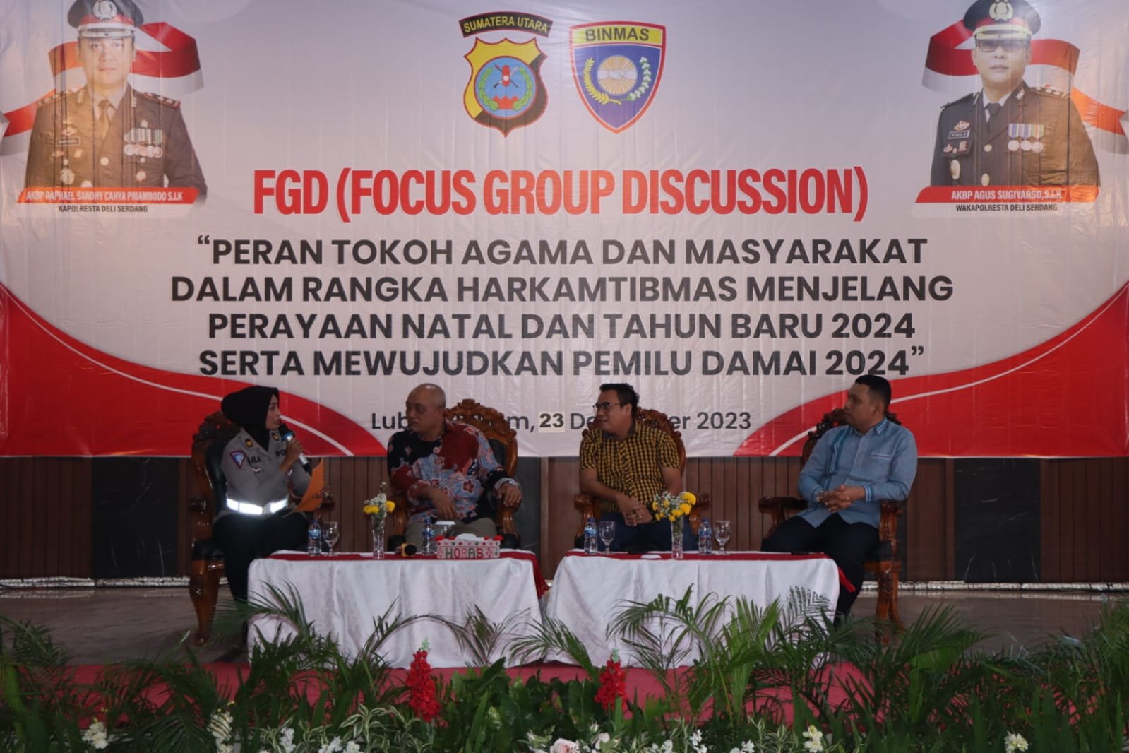 Kegiatan Focus Group Discussion (FGD) yang dilaksanakan kali ini mengambil topik “Peran tokoh agama dan masyarakat dalam rangka harkamtibmas menjelang perayaan Natal dan Tahun Baru 2024 serta mewujudkan Pemilu Damai 2024” yang dihadiri oleh Forkopimda Kabuoaten Deli Serdang, Para PJU dan Kapolsek Jajaran Polresta Deli Serdang, beserta Para Tokoh Agama, Tokoh Masyarakat, dan Tokoh Adat Kabupaten Deli Serdang.