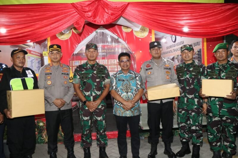 DUTAMEDAN.COM, KOTA TANGERANG – Disela kegiatan menyambangi umat kristiani di malam misa natal gereja-gereja Kapolres Metro Tangerang Kota, Kombes Pol Zain Dwi Nugroho, Wakil Walikota Sachrudin dan Danrem 052/Wijayakrama Brigjen TNI Putranto Gatot, menyerahkan bingkisan kepada sejumlah personil pengamanan gabungan TNI-Polri, Pemkot dan Mitra Kamtibmas yang bertugas di pos pelayanan dan pos pengamanan.