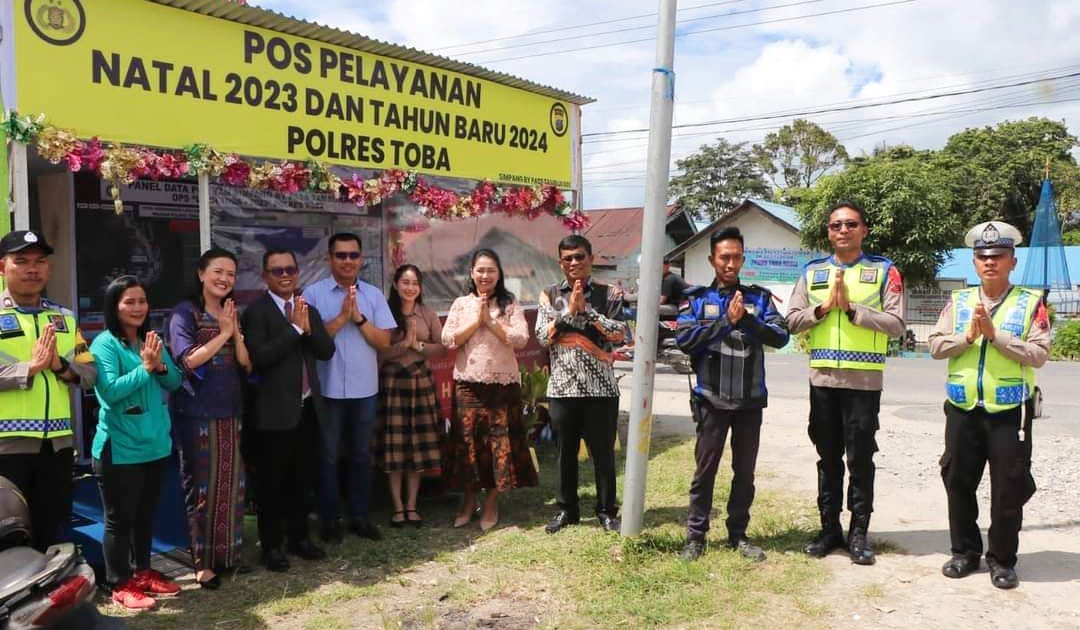 TOBA, DUTAMEDAN.COM – Sepulang ibadah dari Gereja Katolik St.Yosef Balige, Bupati Toba, Poltak Sitorus ,Kapolres Toba, AKBP Wahyu Indrajaya , Sekda Toba, Augus Sitorus, masing-masing didampingi istri mengunjungi Pos Pengamanan Natal dan Tahun Baru (Nataru) di Bundaran Balige ,Simpang Jalan By Pass Tambunan dan Pos SPBU Laguboti, Minggu (24/12/2023).