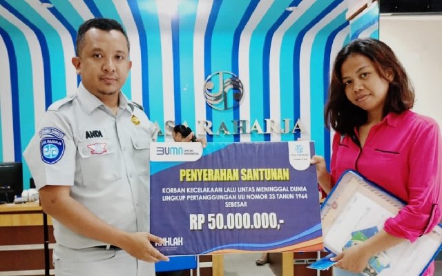 Penyerahan uang santunan sebesar Rp50 juta itu dilakukan pihak PT Jasa Raharja setelah mendapat informasi peristiwa Laka Lantas yang dialami korban, termasuk melakukan pendataan di rumah duka dan menerima kelengkapan berkas dari keluarga korban.
