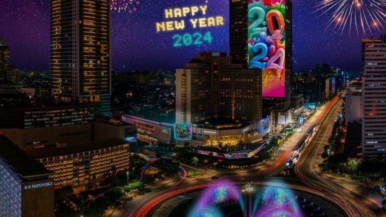 yang menampilkan drone light show, water mist, hingga video mapping 3D, di Bundaran HI, Jakarta, Minggu 31 Desember 2023.