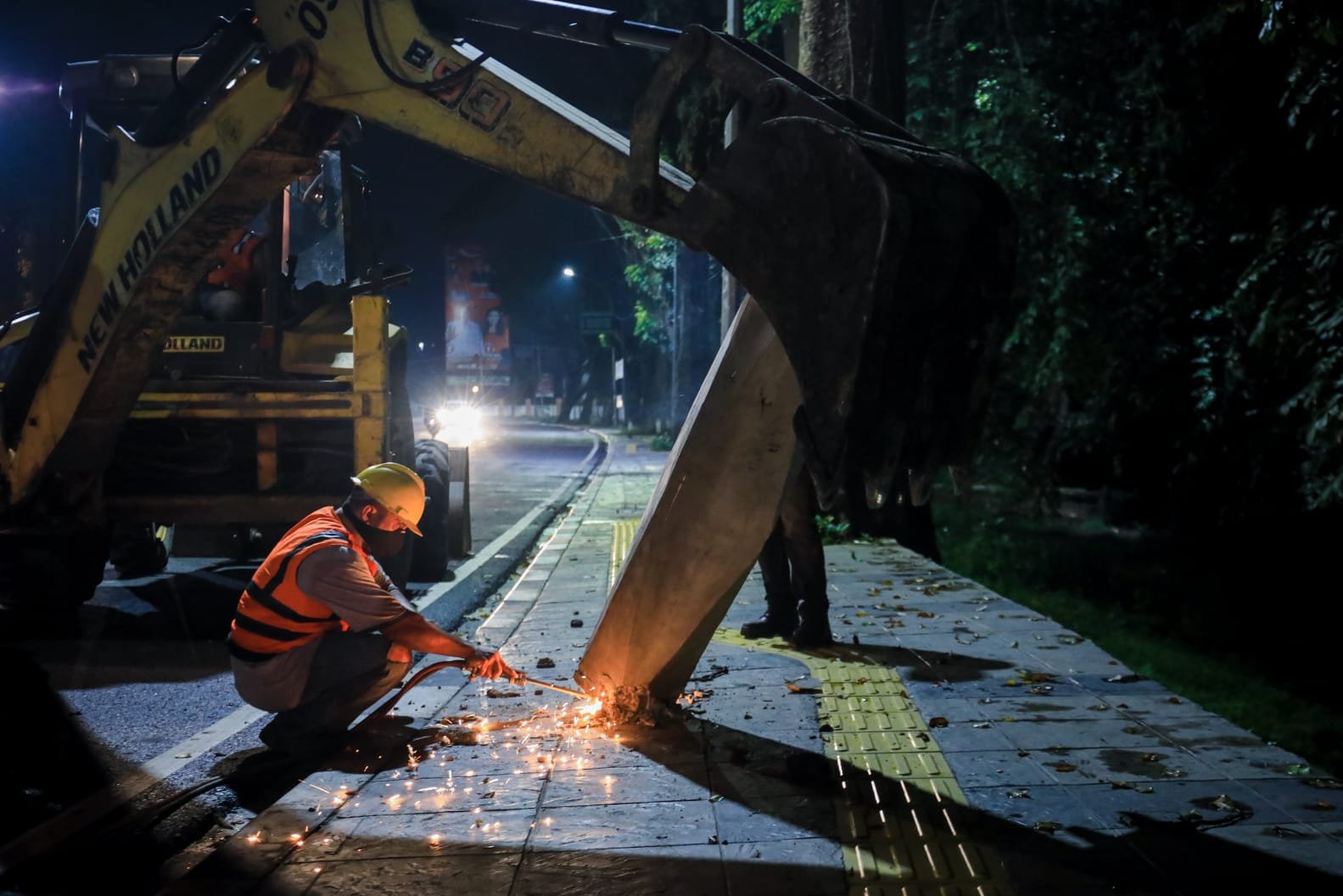 Dengan sangat hati-hati petugas membongkar penyangga lampu jalan yang dibalut dengan semen, sebab petugas tidak ingin jalur pedestrian yang sudah rapi dan indah menjadi rusak. Pembongkaran bagian penyangga lampu ini menggunakan mobil excavator dan mesin las.